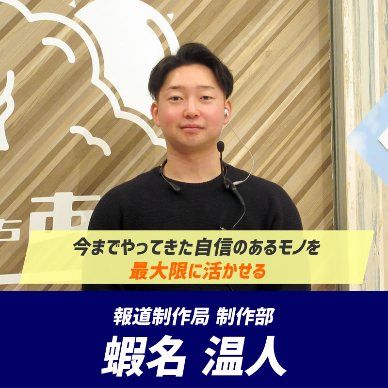 学生時代にあった経験が、次は自分が、夢や希望、そして勇気を持たせられるような番組や様々なコンテンツを世の中に発信していきたいと思い入社を希望しました。高校時代に、硬式野球部のキャプテンとして迎えた最後の年にコロナウイルスの影響で高校球児にとって夢の舞台である甲子園が中止になり立ち直れなかった時期がありました。そんな時にABAが取材に来ていただき、僕が積み重ねてきた過程を全力で応援してくださり、活躍を楽しみにしていると言ってくれた。その時のABAクルーの方々の優しさや温かい温度感を今でも鮮明に覚えています。ABAで成長し、ABAに貢献するという形で恩返しをしたいと思ったのが理由です。