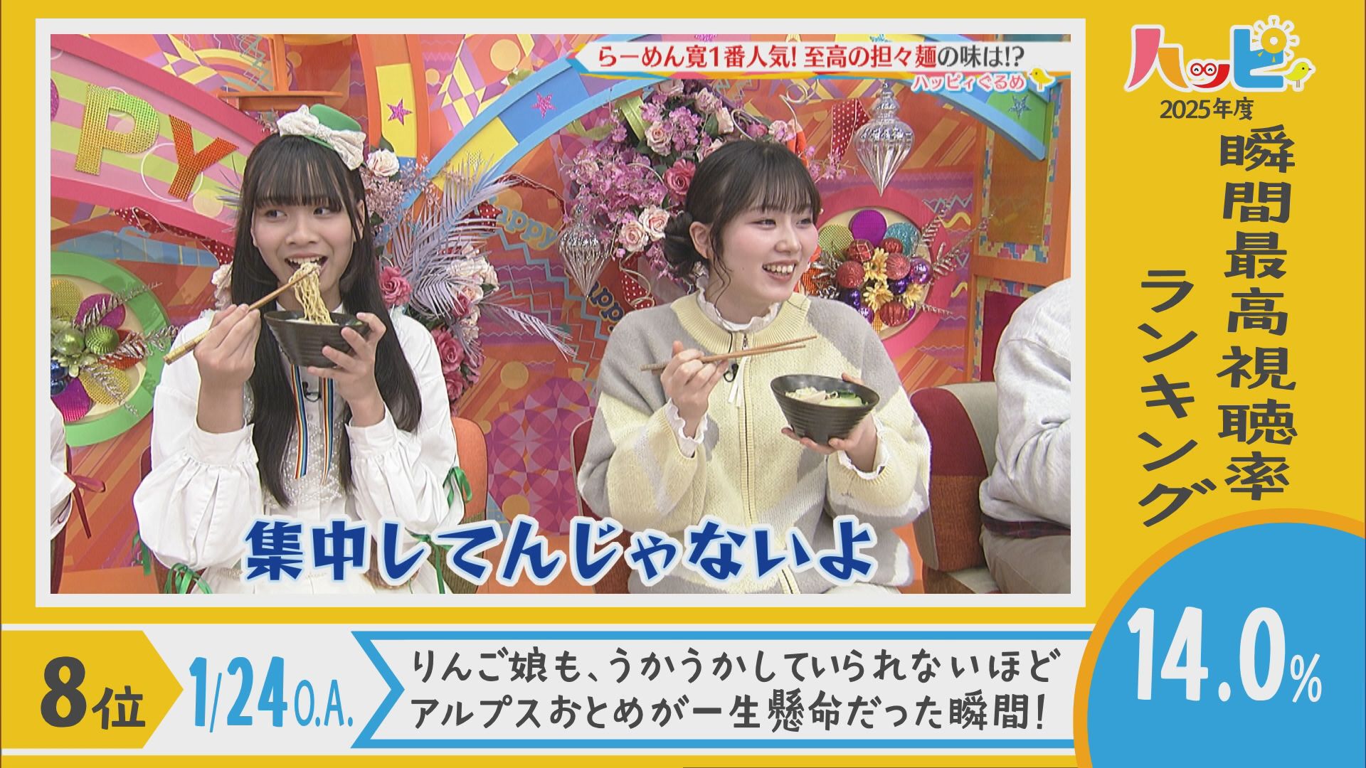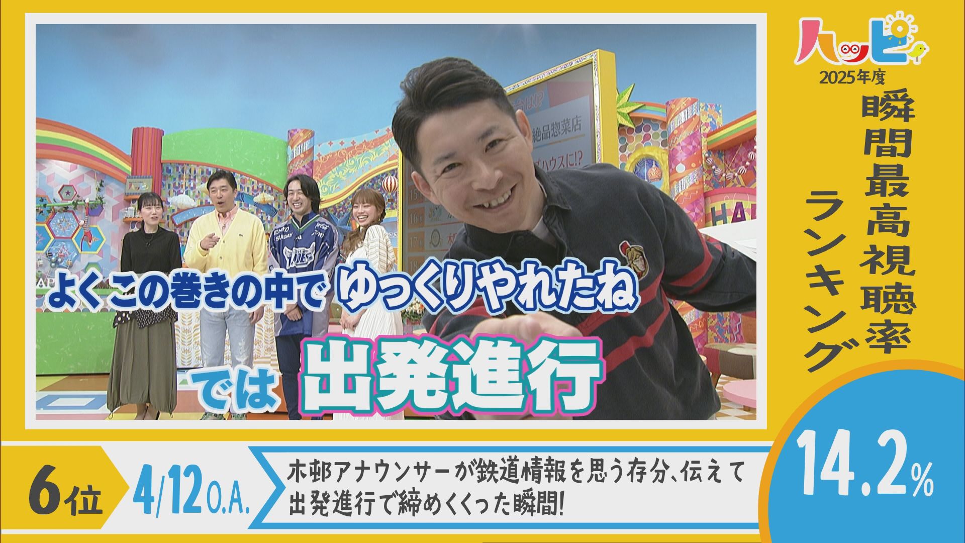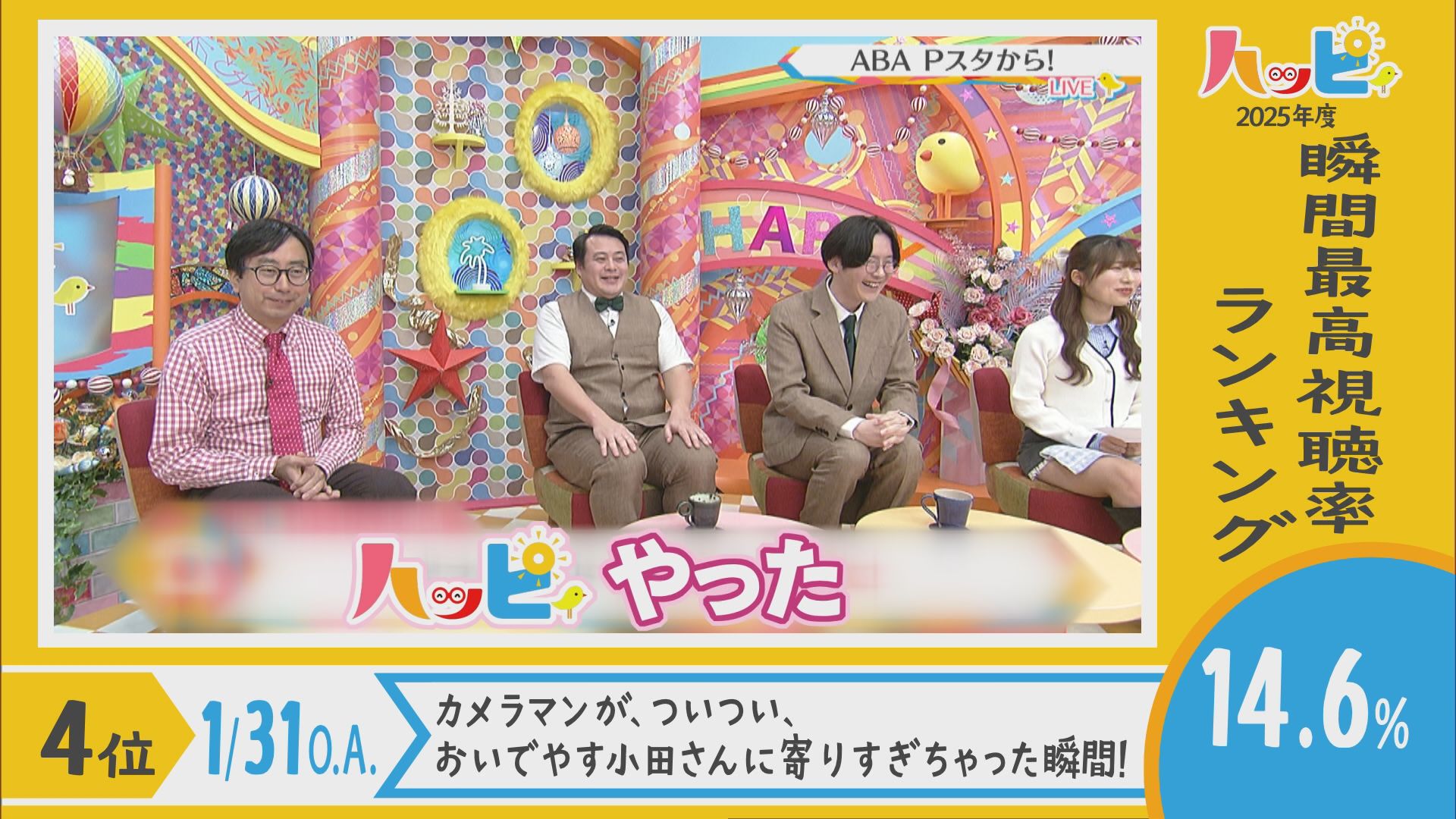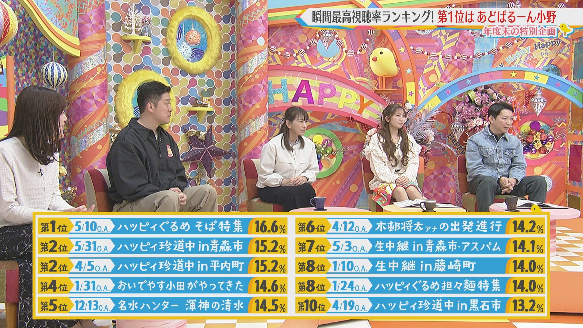 2025年4月5日~2026年3月21日に放送されたハッピィで、 瞬間最高視聴率ランキングを出してみました。 皆さんが見ていたあのシーンは放送されてるかな?