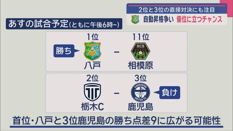 八戸が勝利したとして3位鹿児島が敗れれば、3位との勝ち点差が9まで開き、自動昇格圏内の争いで優位に立つことができます。