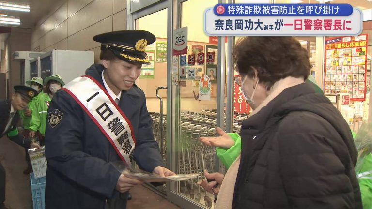 特殊詐欺被害防止を呼び掛け 奈良岡功大選手が一日警察署長に